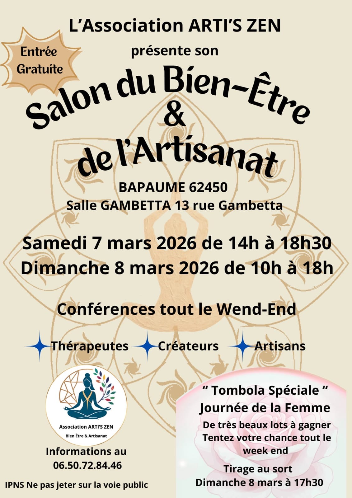 L’association ARTI’S ZEN présente son Salon du Bien-être et de l’artisanat à Bapaume, salle Gambetta le samedi 7 mars 2026 de 14h à 18h30 et le dimanche 8 mars 2026 de 10h à 18h.